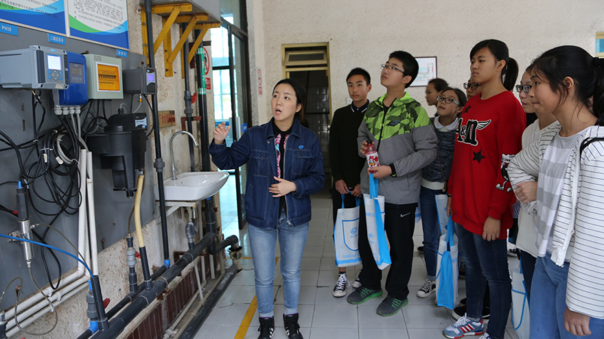 師生代表分成四個(gè)班級(jí),在該集團(tuán)公司解說(shuō)人員的帶領(lǐng)下,分別參觀了三水廠一、二期的制水工藝流程和集團(tuán)公司新建綜合展覽室。在生產(chǎn)現(xiàn)場(chǎng),同學(xué)們從配水井開(kāi)始,沿著預(yù)沉池、斜管沉淀池、加藥間、加氯間、平流沉淀池、V型濾池、送水泵房等生產(chǎn)構(gòu)筑物,按照生產(chǎn)流程一一參觀,見(jiàn)證了自來(lái)水從渾濁變清澈的神奇旅程;在展覽室里,通過(guò)觀看大量圖片、影像資料、實(shí)物、操作觸摸屏以及現(xiàn)場(chǎng)解說(shuō),進(jìn)一步了解到我市供水五十年的發(fā)展歷程。