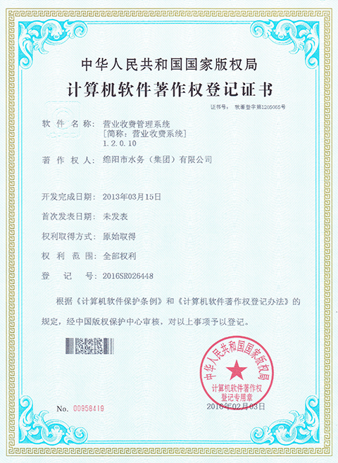 近日,由集團(tuán)所屬綿陽水務(wù)集團(tuán)自主研發(fā)的營業(yè)收費(fèi)系統(tǒng)獲得國家版權(quán)局計(jì)算機(jī)軟件著作權(quán)登記證書。這標(biāo)志著綿陽水務(wù)集團(tuán)在擁有自主知識(shí)產(chǎn)權(quán)方面實(shí)現(xiàn)零的突破。